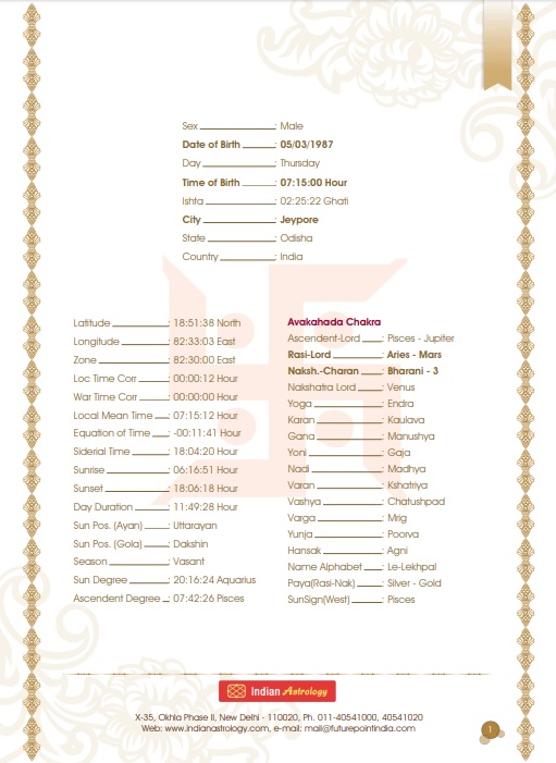 Free Hindi Janam Kundli, नि:शुल्क संपूर्ण जनम कुंडली हिंदीमे This online Hindi Horoscope/ janam Kundali/ Janampatri service gives you detailed analysis of your Birth chart with detailed Predictions and Vimshottari dasha predictions along with doshas and remedies details. You can take printout of this Horosocpe or you can make it as PDF to email it.