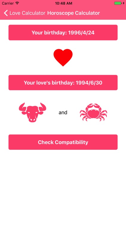 Love Compatibility Calculator Love Compatibility Calculator Love Compatibility Calculator To find out what the chances for you and your dream partner are, just fill in your and his or her Info and click Calculate. Fun Astrological Signs Calculator Days until Christmas Love calculator Phone Number Converter Your Birth Date His/Her Birth Date Show Explanation Instructions Tweet
