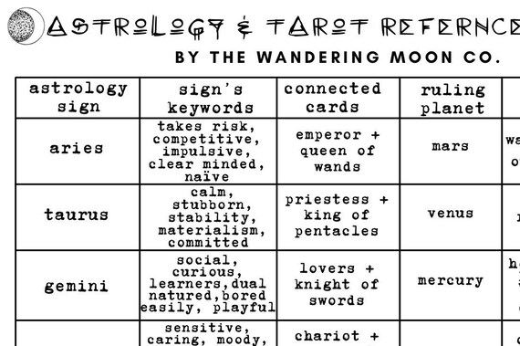 astrology and tarot reference guide, cheat sheet, PDF, downloadable printable, tarot journal, book of shadows, journal page
