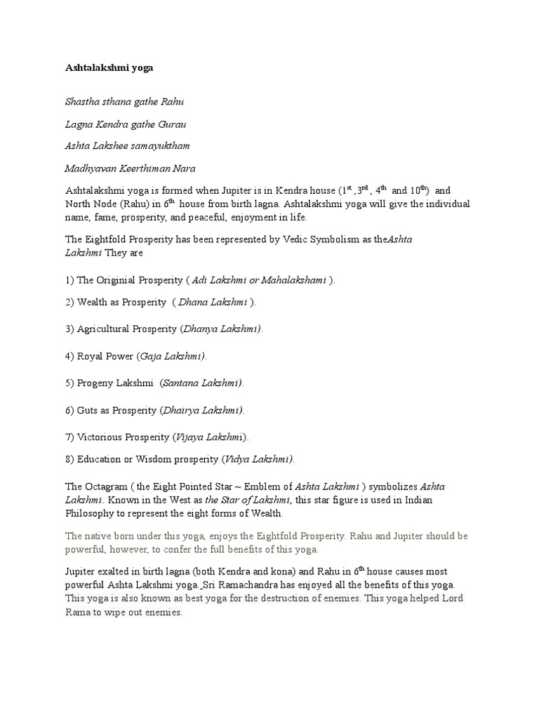 Ashta Lakshmi Yoga ?? - Mystic Board Ashta Lakshmi Yoga ?? For vedic astrology discussions and general questions. Moderators: shalimar123, eye_of_tiger, suzisco, RishiRahul. 5 posts • Page 1 of 1. princess Posts: 7 Joined: Wed May 02, 2007 4:30 pm. Ashta Lakshmi Yoga ?? Post by princess » Wed May 23, 2007 7:06 am