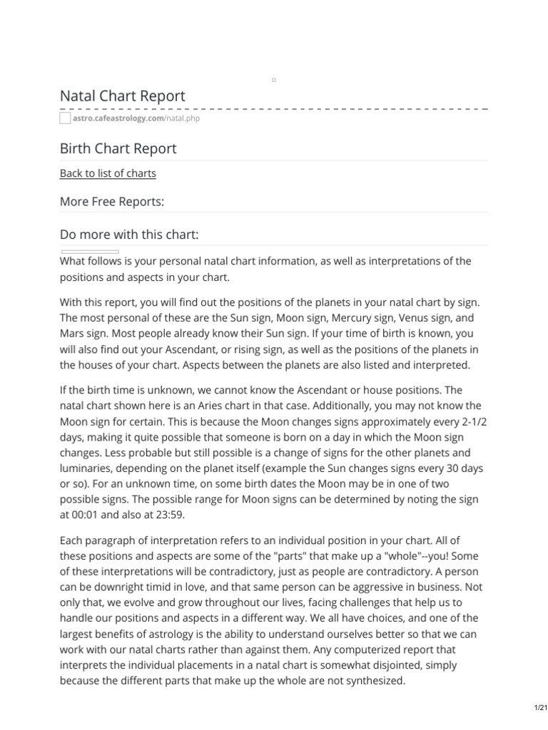 Understanding the Astrological Chart Wheel | Cafe Astrology .com I am using the example chart with data: January 1, 2000, at 12:00 PM, in Toronto, Canada. This is the default chart in the Free Report Section here.. When you enter this data in the Free Report Section of the site, you will see a list or table of planetary positions and house cusps in the report itself, which I have copied here: Free Sidereal Birth Chart Calculator | Cafe Astrology .com See also Cafe Astrology’s Free Reports site, including full interpretations of the natal chart, transits, and compatibility, online since 2002. The interpretations in the birth chart report are written by myself, Annie Heese, and are typically expanded interpretations already found on this site. Birth Chart Interpretations | Cafe Astrology .com Birth Chart Interpretations . Natal Chart Interpretation: Once you have your natal chart (or astrology birth chart), you can learn about the positions of the planets and points by sign, house, and aspect. Digging deeper into the natal chart, we can interpret such things as the lunar phases, hemisphere emphasis, and so forth.